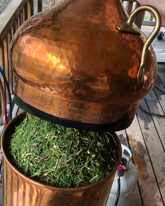 In order to capture the plant's cellular water and nutritive components, I slow distill fresh, locally grown plants from my property and near by farms and fields. My process captures all of the volatiles (essential oil) but more importantly, the cellular water from the living plants. I distill in both traditional copper alembic and hybrid copper and stainless steel stills for high-quality distillates. My hydrosols are collected and stored in glass carboys and preserved.